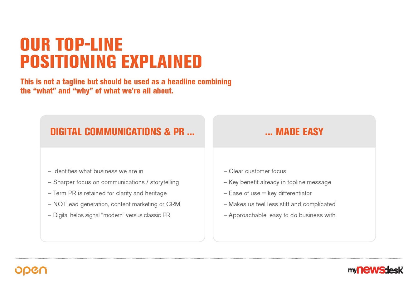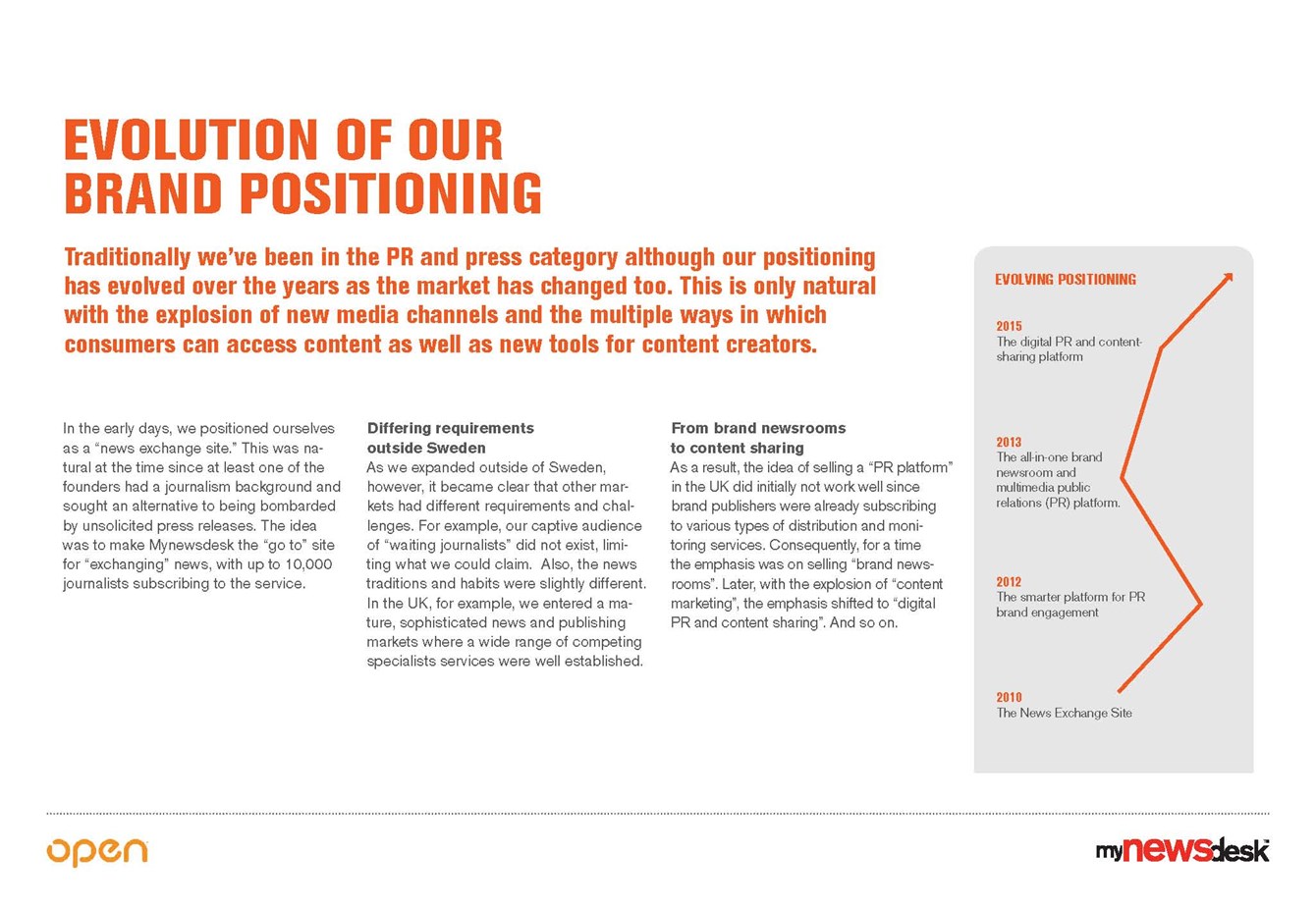 What we did. Open ran a series of strategic branding workshops to define the offering and purpose. The process resulted in a clear purpose based around storytelling: "To release the power of stories to spark positive change." Mynewsdesk's CMO described the project as a huge success and praised the smooth process.